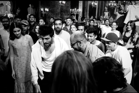Kartik took to Instagram, where he shared a monochrome video featuring him along with Vidwans and actress Ananya Panday dancing on the sets of the upcoming film.