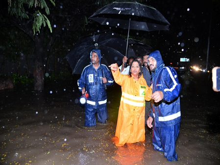 Massive downpour turned several key roads turned into lakes. Water accumulation near Integrated Police Command and Control Centre on Road Number 12 Banjara Hills brought the traffic on the busy road to a complete halt. Greater Hyderabad Mayor Vijayalaxmi Gadwal was personally supervising the efforts to clear water stagnation.