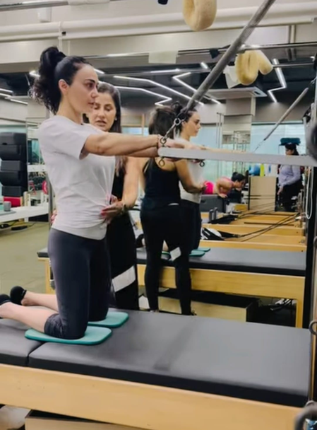 Preity was seen stretching her core in a back strengthening exercise during her recent workout session. She slowly bent forward, stretching her back, and came back in a singular motion.