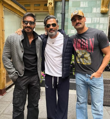 Taking to his Instagram stories, Suniel posed alongside his son Ahan and Ajay