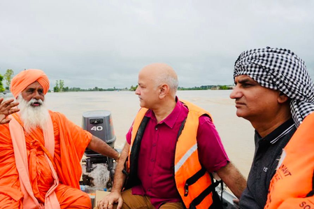 Before dawn, riding on self-acquired motor boats the AAP’s Rajya Sabha MP, Sant Seechewal, and his team of volunteers, donning protective gear, reach villages dotted in the Mand region of Sultanpur Lodhi, severely impacted by the swollen Beas river, to provide food to the families trapped in waist-deep water.